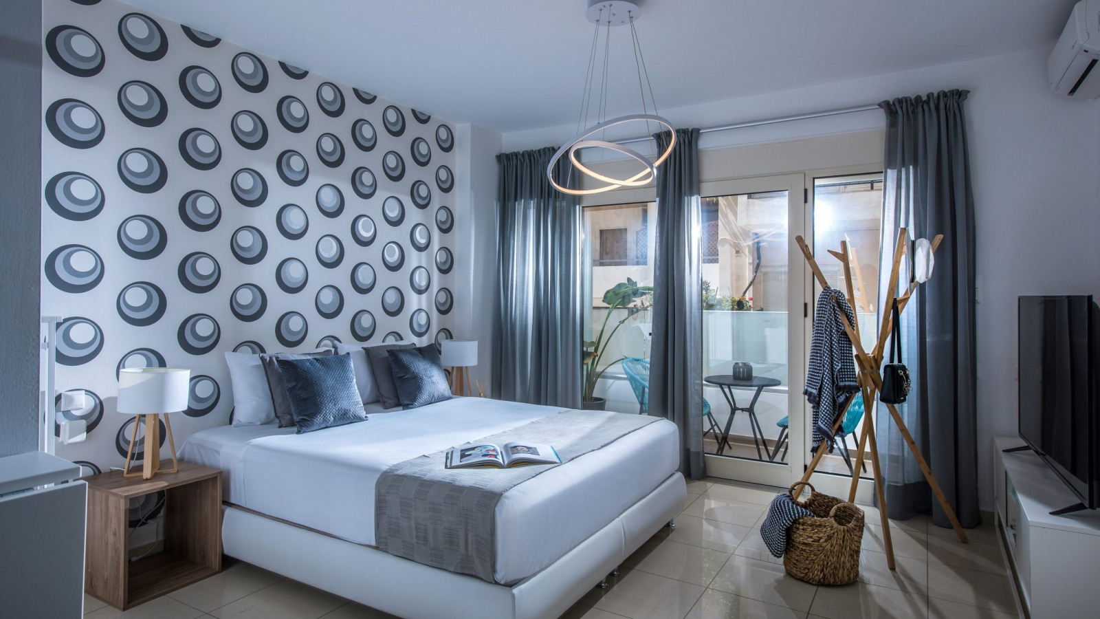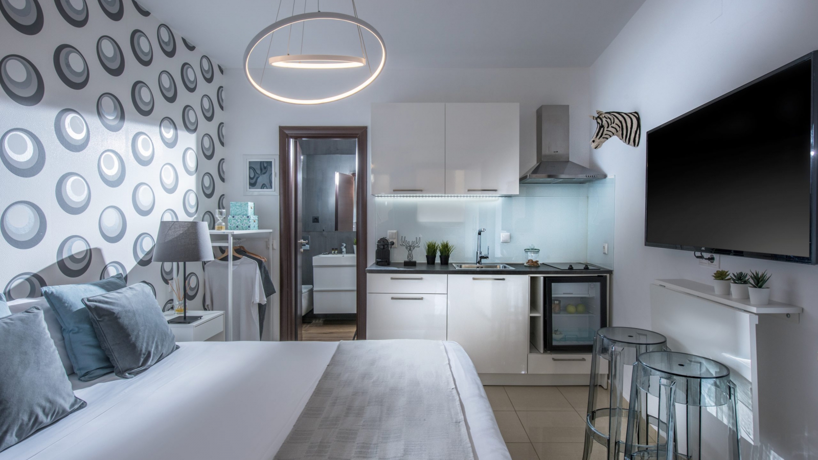 All our Suites & Apartments leading onto a large balcony with city views in a quiet street ideal to relax and pass magical moments in Heraklion. All our air-conditioned apartment consists of one bedroom and a fully equipped kitchen. All units offer a private bathroom plus a washing machine. A flat-screen Smart 55′ Netflix TV plus a second 32′ Smart TV in the bedroom and free WIFI is provided.